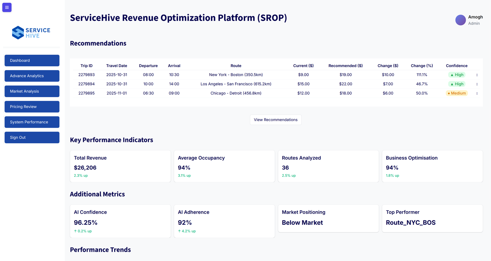 Monitor live performance insights, recommendations, key indicators, and revenue trends on a single unified dashboard.